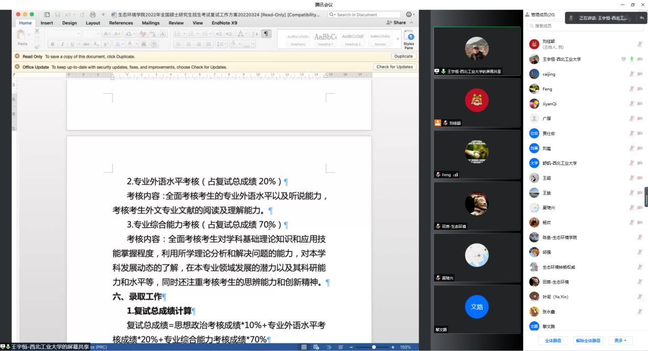 王宇恒首先给参会导师介绍了无码视频 2022年硕士研究生招生考试复试情况,包括学校招生政策、学院指标总数、推免已录取总数、考生的上线情况、学院导师的指标分配情况等。并带领参会导师一起研讨下周即将进行的硕士研究生招生复试方案,重点强调复试方式、复试时间安排、复试内容、复试录取原则等。