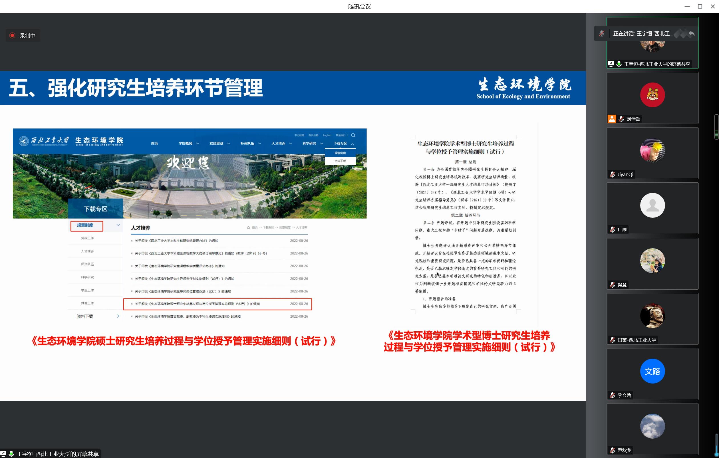 王宇恒在会议上指出学院已经出台研究生招生指标分配管理细则和研究生培养管理制度来规范研究生招生、培养、学位授予等环节。各位导师也纷纷表示将会配合学院培养好每一位研究生