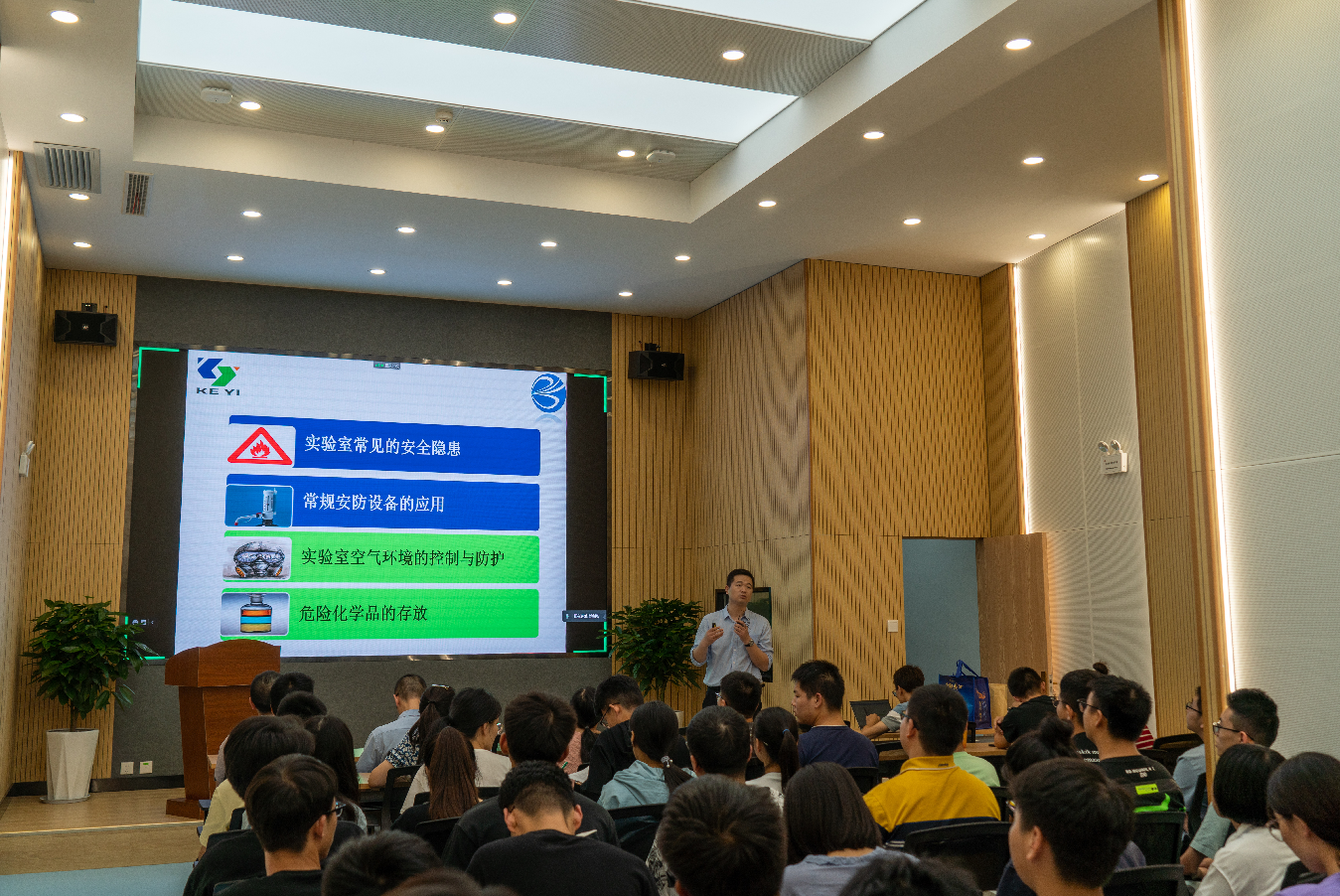 随后,陕西科仪公司总工程师刘涛从实验室常见的安全隐患、常规安防设备的应用、实验室空气环境的控制与防护、危险化学品的存放等方面进行了详细专业的讲解。针对实验室常用的水、电、气、火、试剂基本安全操作和安全防范措施,及有关化学、微生物基本操作及安全防范等内容,结合学院现有科研平台实际情况和案例分析,提出实验室安全风险管理思路,并同与会人员进行了生动、有趣的互动。整个培训讲授持续了2个小时。