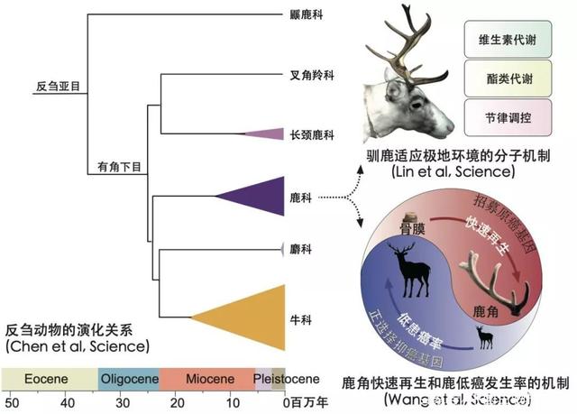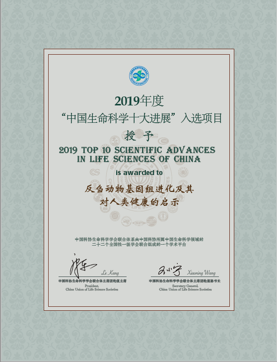2019年度中国生命科学十大进展,团队联合国内外多家单位,阐明了长期有争议的反刍动物进化历史,解析了反刍动物独特性状的遗传基础;探究了鹿角快速再生和鹿抗癌能力的遗传基础;揭示了驯鹿昼夜节律丧失、高效维生素D和钙代谢等的分子机制。该研究探索开拓了研究重大生命现象的新途径,成果的三篇研究长文以封面故事同时发表于《科学》杂志(Science,2019,364:eaav6446;Science,2019,364:eaav6335;Science,2019,364:eaav6312)。