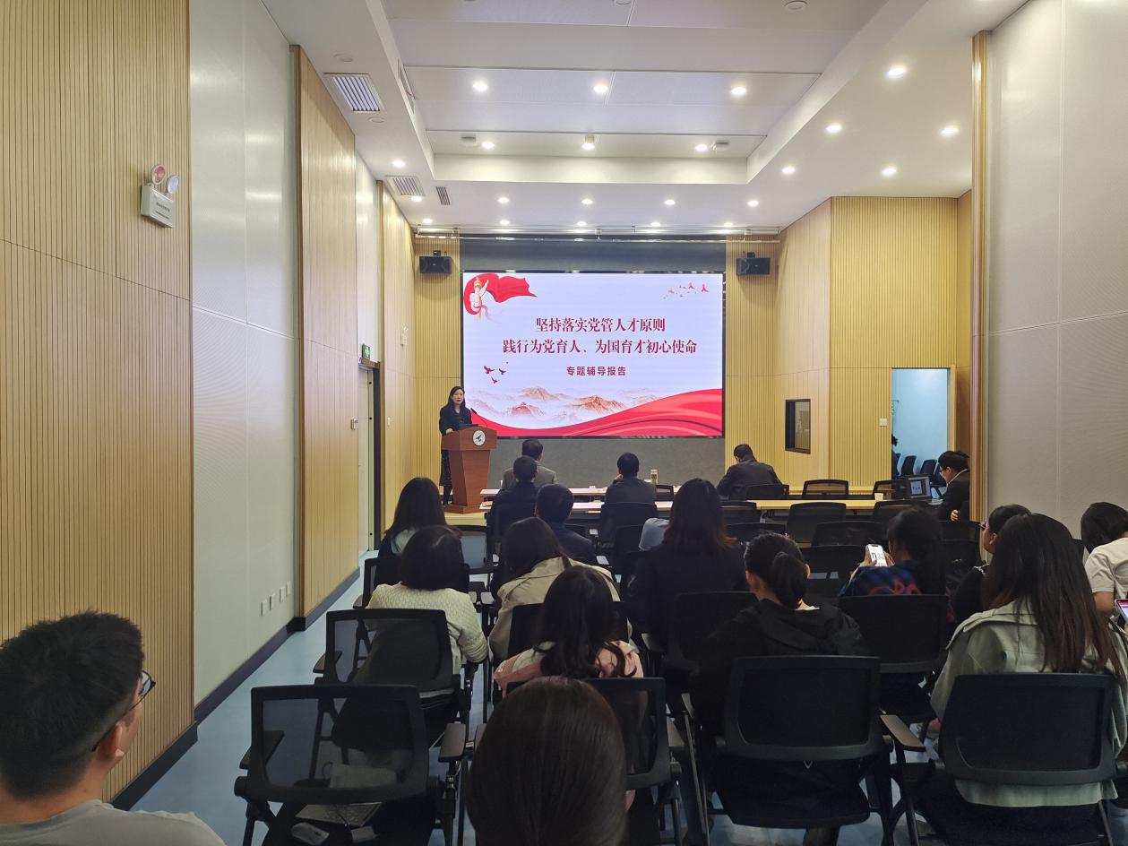 举办落实党管人才原则专题辅导报告。报告由党总支书记、副院长牟蕾主持,学院党总支理论中心组成员、教职工党支部党员、本科生和研究生任课教师、办公室管理人员、学生支部书记参加本次活动。