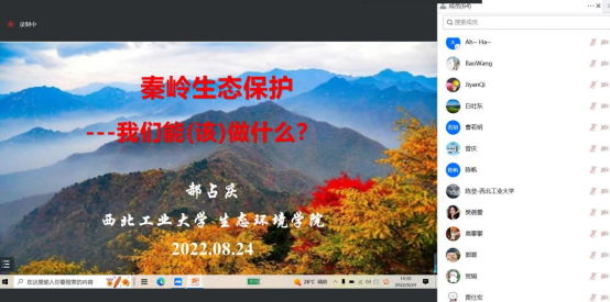 为进一步深入学习贯彻习近平生态文明思想,引导全体师生心怀“国之大者”,服务国家重大战略需求和社会经济发展,2022年8月24日,学院组织召开生态文明建设专题辅导报告,邀请我院“陕西省秦岭生态环境保护委员会”专家、“陕西省秦岭生态经济发展软科学研究基地”负责人、“陕西省秦岭生态智能化监测与保护重点实验室”主任郝占庆教授为全体教职工和全体师生党员作了题为《秦岭生态保护,我们能(该)做什么?》的专题报告。报告由学院党总支书记、副院长牟蕾主持。
