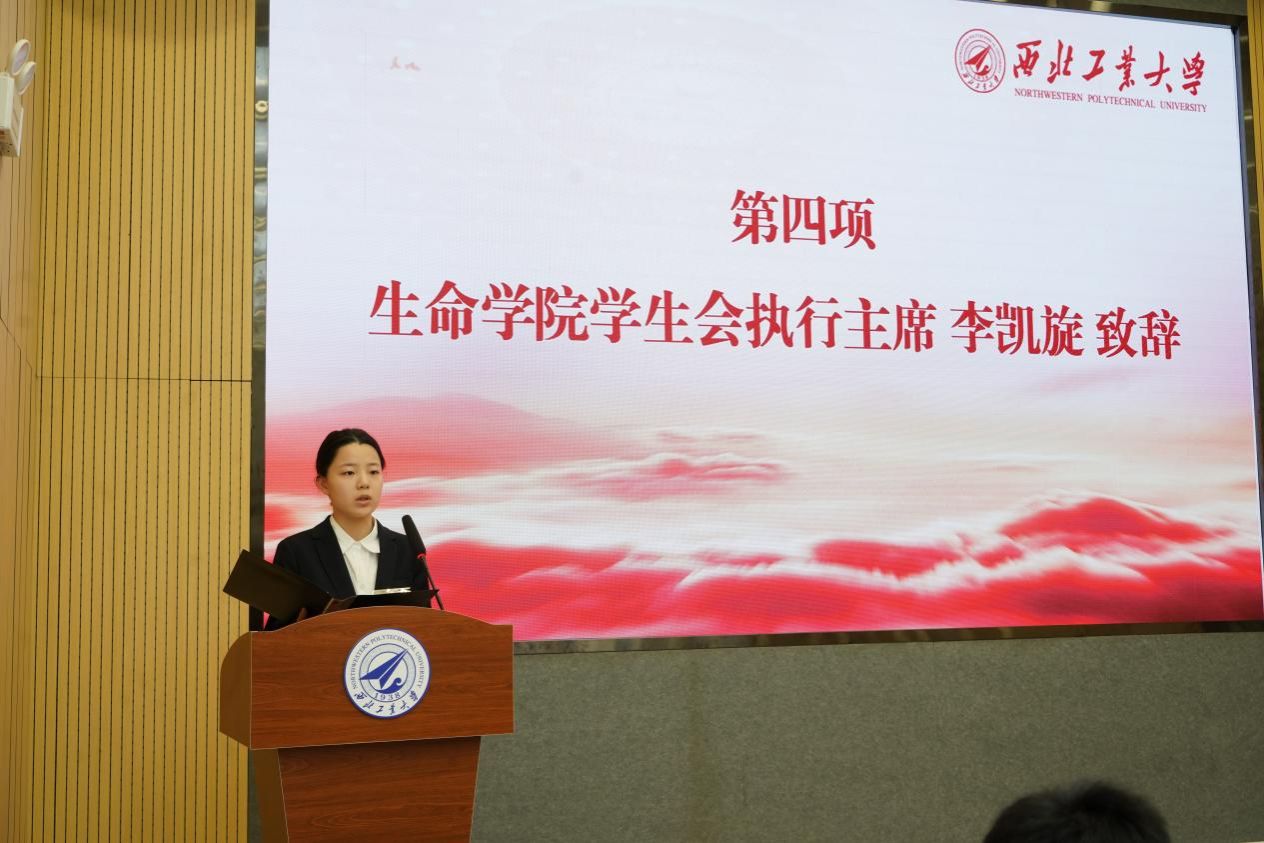生命学院学生会执行主席李凯旋致辞,她从树立远大理想、打好专业基础和严格自律意识等三方面和大家分享了几点工作经验,并表示期待两院学生分会能够进一步加强合作、共同进步。